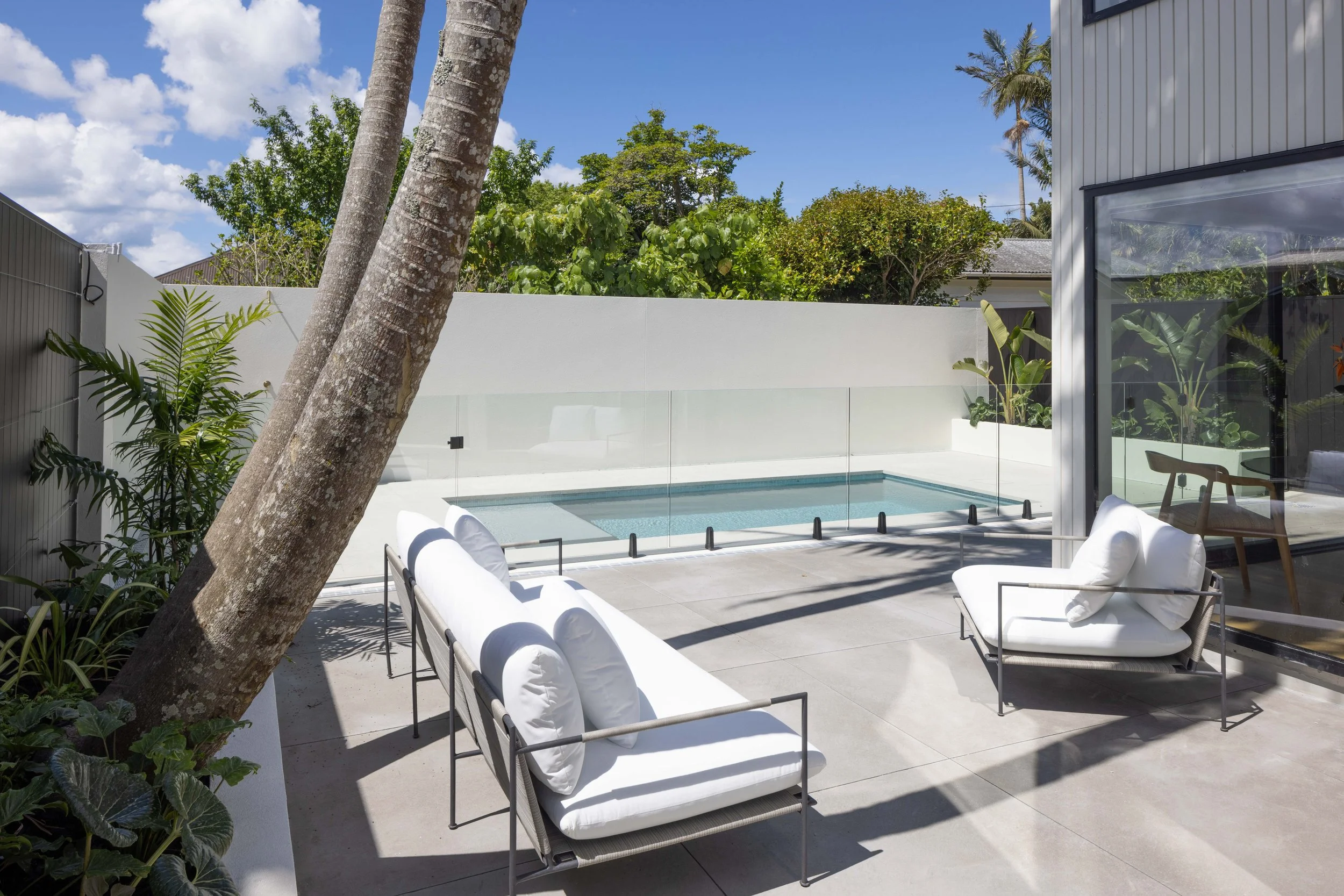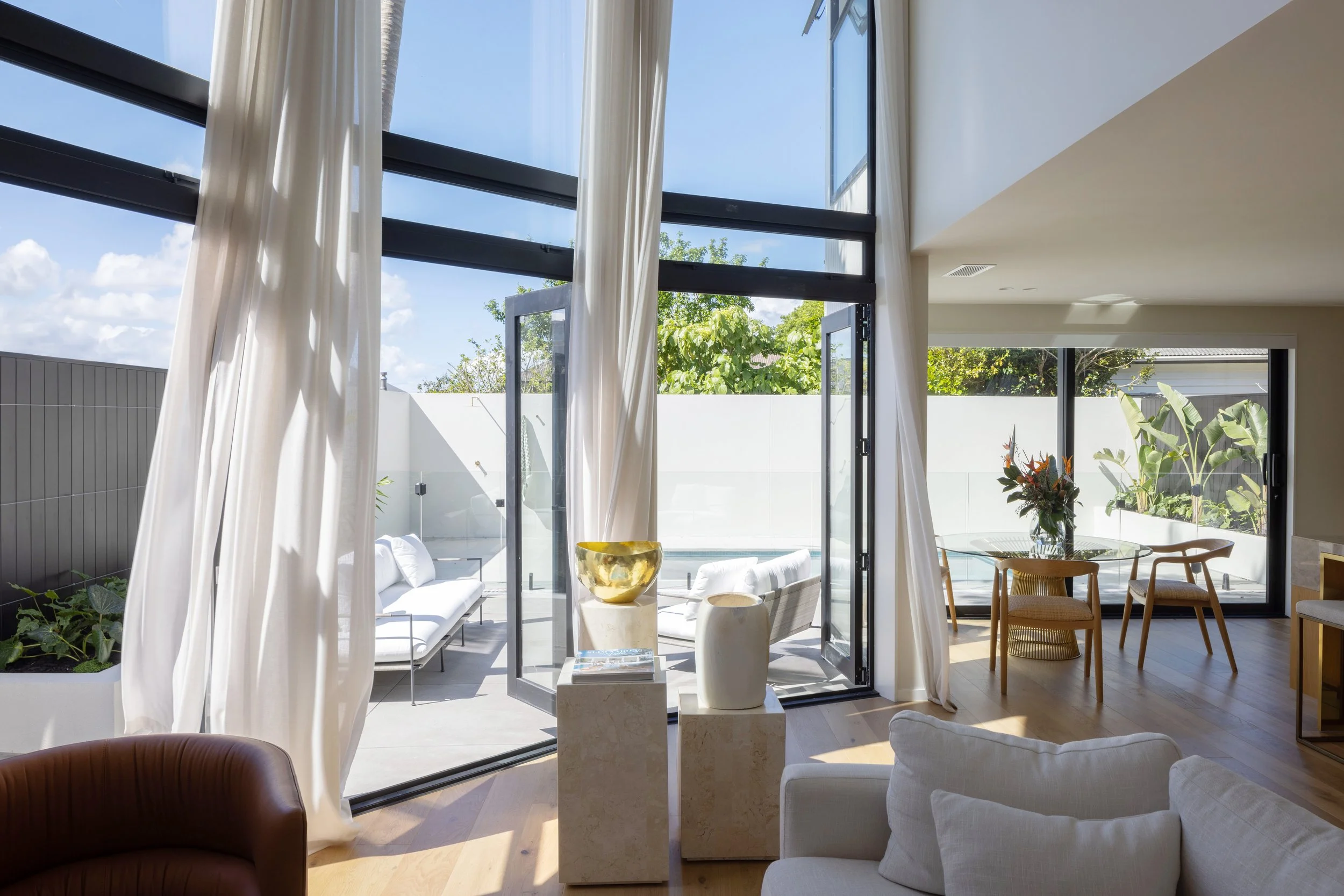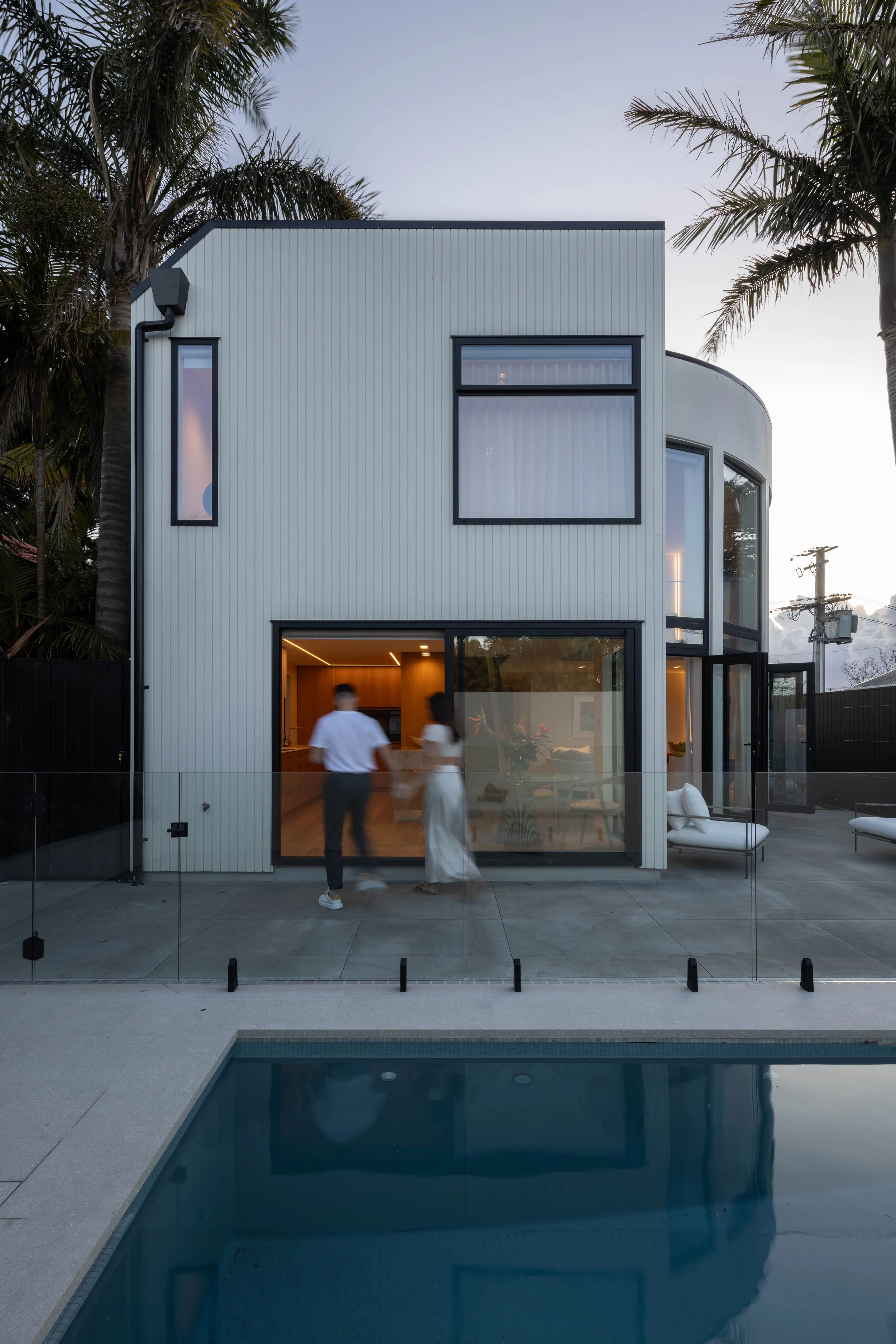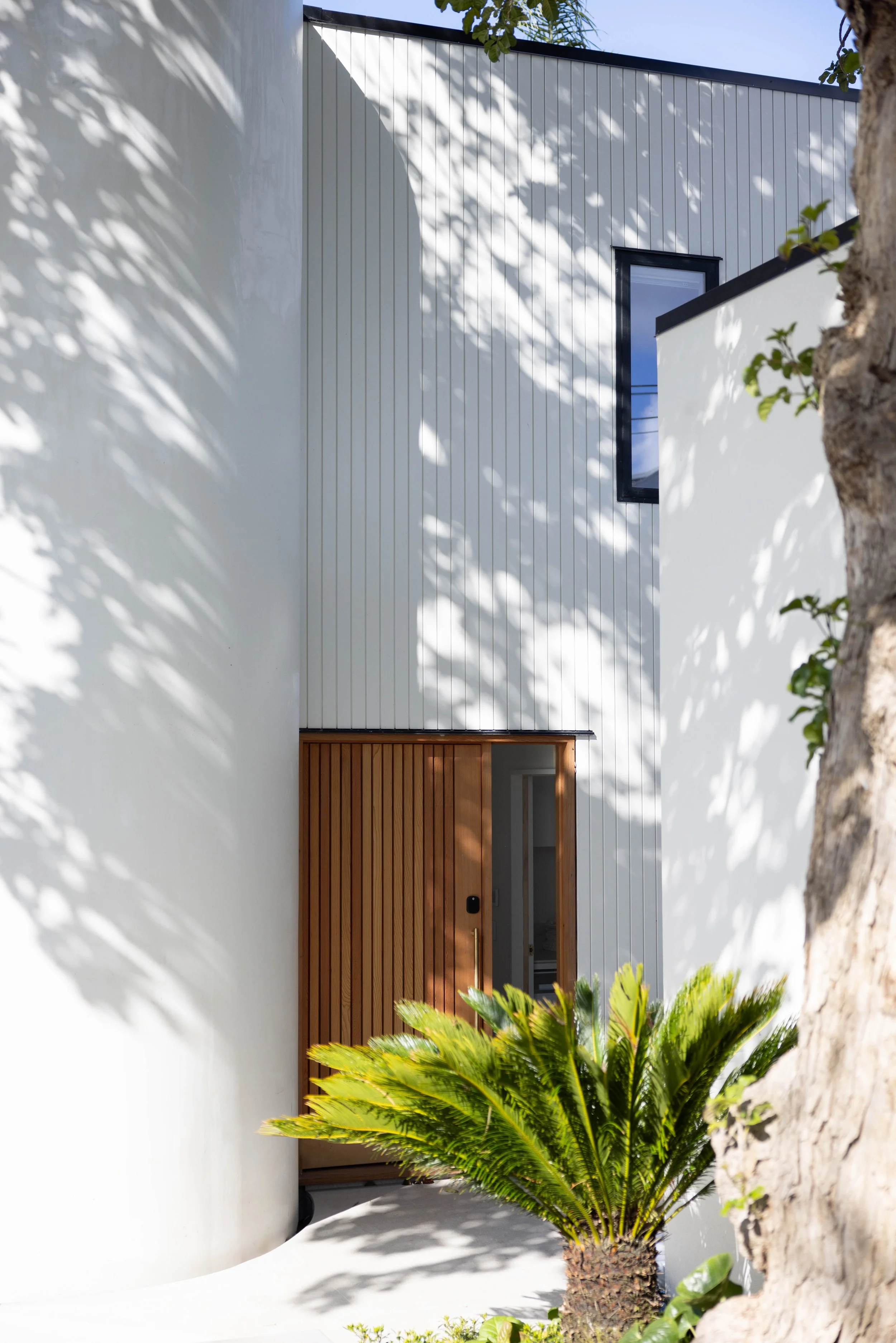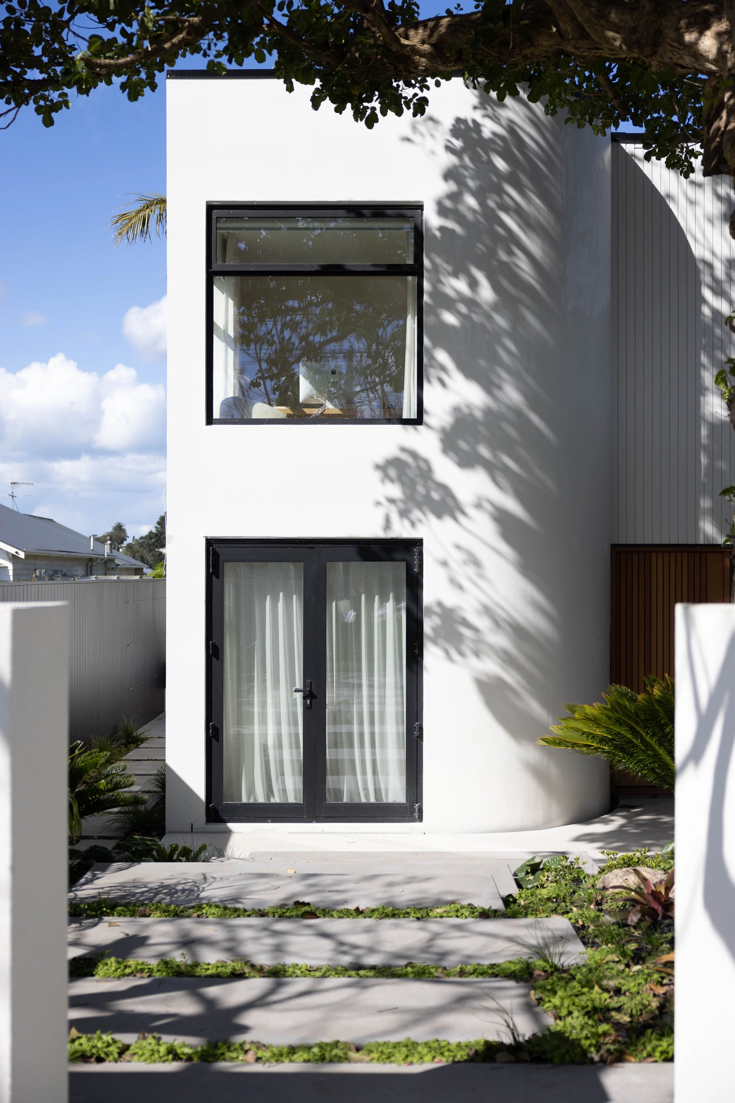This full renovation and reclad gave an existing plaster home a new life - the character elements were retained with tall, curving walls and double height joinery defining the unique form of the house. The new garage carefully worked around the roots of the mature Puriri to frame the front yard, and the landscaping guides visitors around to the new pool area.
